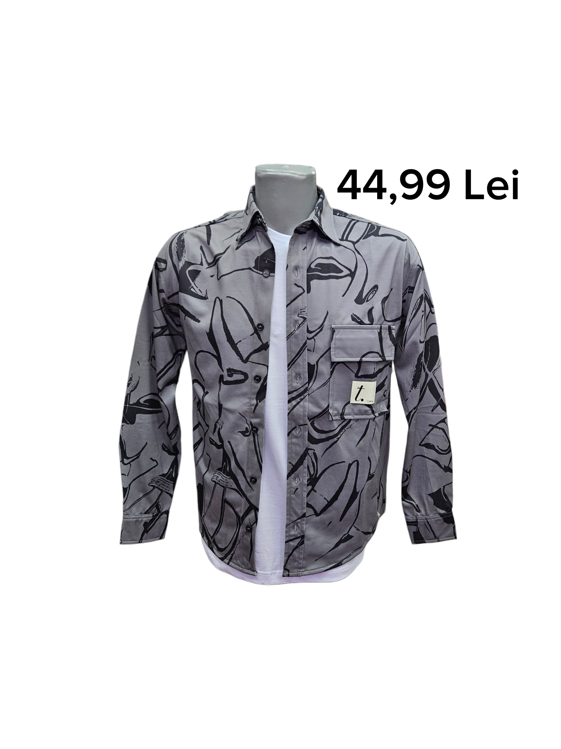 Camasa Axi- 44,99 lei; casual tip over- shirt, cu maneca lunga, imprimeu fundal gri si grafic abstract cu linii negre pe toata suprafata, buzunar aplicat pe piept cu eticheta decorativa, cu nasturi, marimi disponibile de la S-2XL