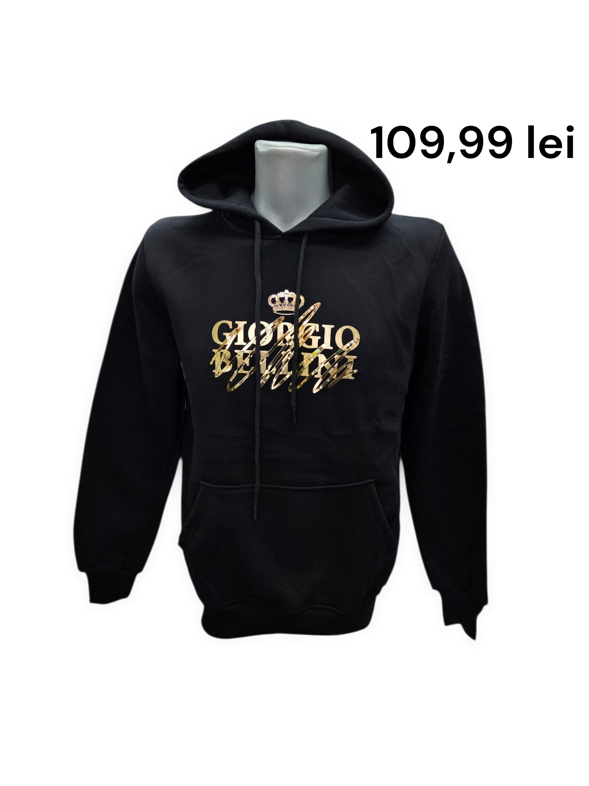 Hanorac Reccardo-109,99 lei; croiala confortabila, foarte gros, ideal pentru sezonul rece, gluga reglabila cu snur, buzunar frontal tip marsupiu, imprimeu frontal auriu, cu aspect premium