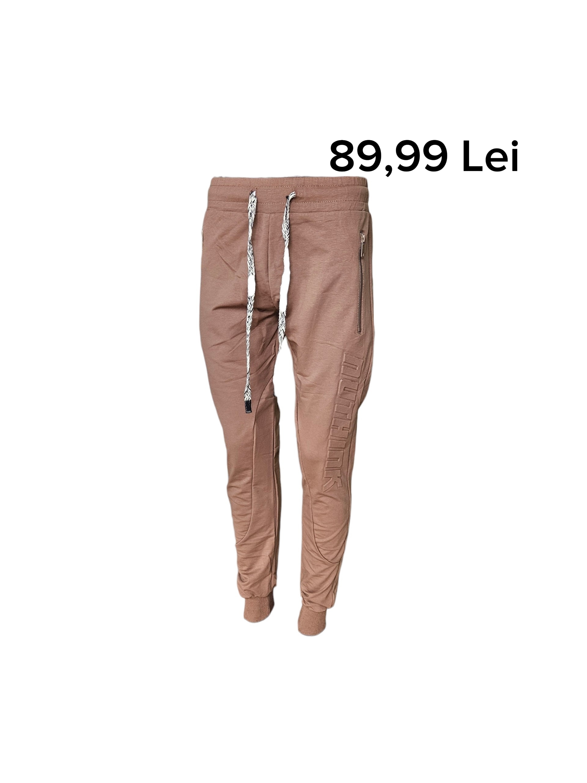 MAXX Grup Bacau > Pantaloni treining > Pantaloni treining Be Good- 89,99 lei; model sport, culoare maro-cafeniu, cu talie elastica si snur alb/negru ajustabil, imprimeu in relief embosat pe picior, 2 buzunare cu fermoar si unul la spate, disponibil si pe alb