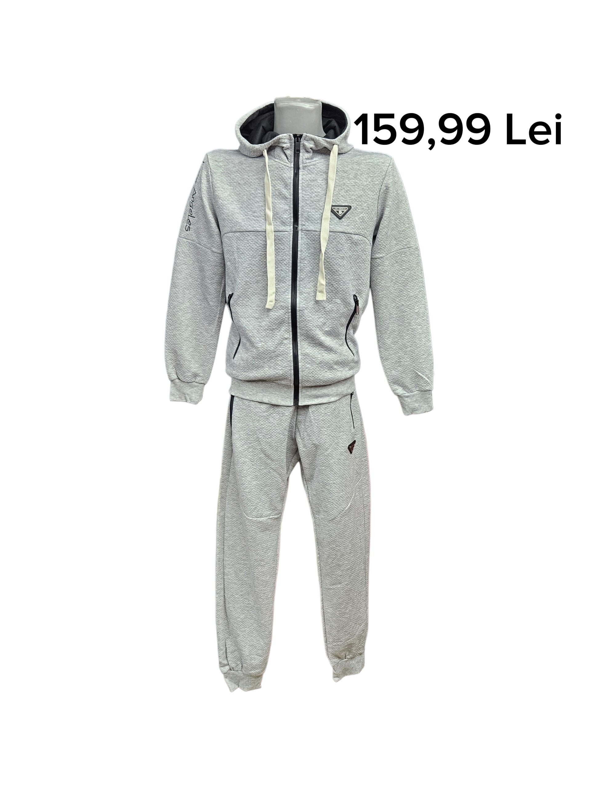 Treining Be Good- 159,99 lei; textura discreta in relief pe material, hanorac cu gluga si snur alb, fermoar central negru, 2 buzunare cu fermoar, imprimeu tip emblema pe piept, imprimeu brodat pe maneca, pantaloni stil jogger, cu mansete elastice, buzunare cu fermoar